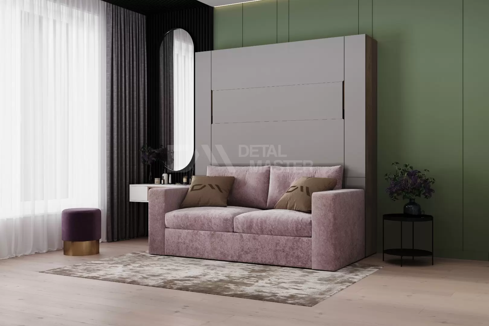 Шкаф-кровать трансформер с диваном " Nova Comfort Balance 2.0." работает на механизме раскладывания собственной разработки "Balance". Кровать раскладывается легким движением руки, превращаясь в полноценное спальное место. Просто потяните за ножку-маятник, которая самостоятельно фиксируется в нужное положение при опускании.